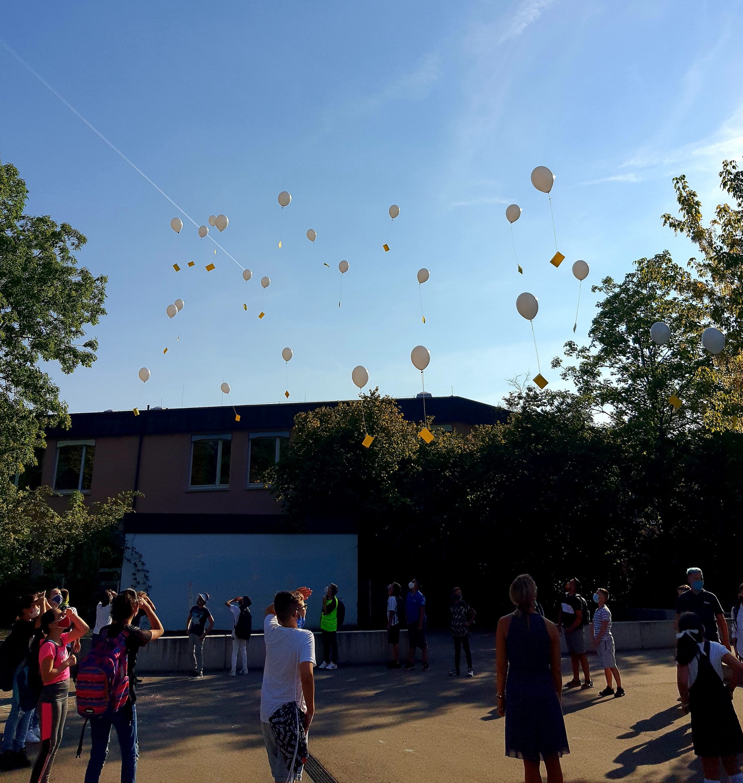 In ihrer folgenden ersten Unterrichtsstunde mit ihrer Klassenlehrerin überlegten sich alle Schüler*innen dann ihre Wünsche an die Schulzeit, um sie dann an weiße Luftballons zu binden. Schülerinnen und Schüler, Eltern und Lehrerinnen schauten gemeinsam den Luftballons hinterher.